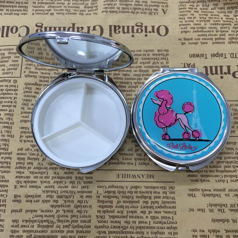 Graceful Round shape pill box with epoxy logo , The top can change to leather decorated also.